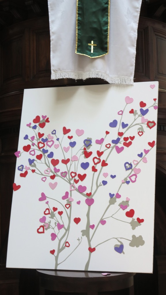 Vous n’avez pas à vous comparer aux autres. Vous n’avez pas à regarder à droite et à gauche. Il n’y a aucune rivalité parce que vous êtes unique au yeux de Dieu. L’invitation de Dieu est unique en votre coeur et vous dit : toi suis moi. Dieu est le même hier, aujourd’hui et éternellement, et ce qu’il a fait pour Pierre, il le fait aussi pour vous. Ne regardez pas à gauche, à droite, ne vous jugez pas, ne vous comparez pas, et n’ayez pas peur que quelqu’un prenne votre place. Il a une place juste pour vous. Jésus vous appelle et vous dit : Toi suis moi ! C’est ce que cet arbre symbolise. Dans la parabole du cep et des sarments (Jean 15), Jésus nous dit : Je suis le cep et vous êtes les sarments. Demeurez en moi, et je demeurerez en vous. Ce 26 août 2012, à la FPMA Aix Marseille, des personnes ont reçu cet appel ou ont déjà répondu à cet appel, et ont accroché symboliquement un coeur en réponse à l’appel de Dieu.